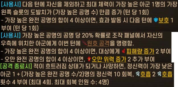 3스킬은 아군의 정신력을 회복시켜준 다음 크리티컬 확률을 늘려주는 호흡을 부여합니다.
